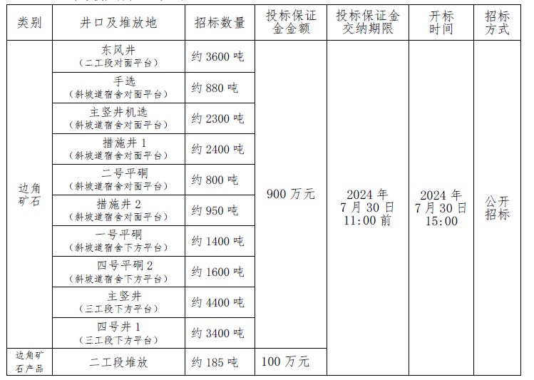 注:本次招標產品數量為預估數,投標按干礦報價,中標結算濕礦以實際過磅數為準,水分按2%扣除計算干礦;邊角礦石產品水分由中標人及我公司相關科室、車間人員現場取樣、我公司化驗的水分數據為準。如中標人需要,我公司開具甘肅省增值稅普通發票(黃金)。
