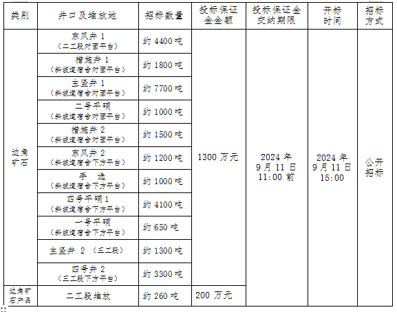 本次招標產品為我公司邊角礦石。投標人需提供“三證合一”的營業執照復印件、法人授權委托書(原件)并加蓋企業公章,于2024年9月10日 10: 00 前將上述材料送交甘肅省合作早子溝金礦有限責任公司人力資源法務人員進行審核,審核合格后的單位應于2024年9月11日10:00前交納投標保證金(見下表,保證金須以轉賬方式支付)。投標保證金交納金額與我公司招標文件要求不符的、投標保證金未及時到賬的視為廢標。若投標人最終未中標,則由投標人開具收款收據后,我公司將一次性無息退還投標保證金。