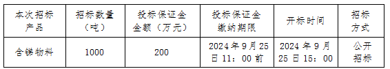 本次招標產品為我公司含銻物料產品。投標人需提供“三證合一”的營業執照復印件、法人授權委托書(原件)并加蓋企業公章,法人及受托人身份證復印件(加蓋企業公章),于2024年9月23日17:00前將上述材料送交甘肅招金貴金屬冶煉有限公司財務科進行審核,審核合格后的投標人于2024年9月25日11:00前繳納投標保證金。投標保證金交納金額與我公司要求不符的,視為廢標;如投標保證金未及時到賬的,視為放棄投標。若投標人最終未中標,則由投標人開具收款收據后,我公司將一次性無息退還投標保證金。