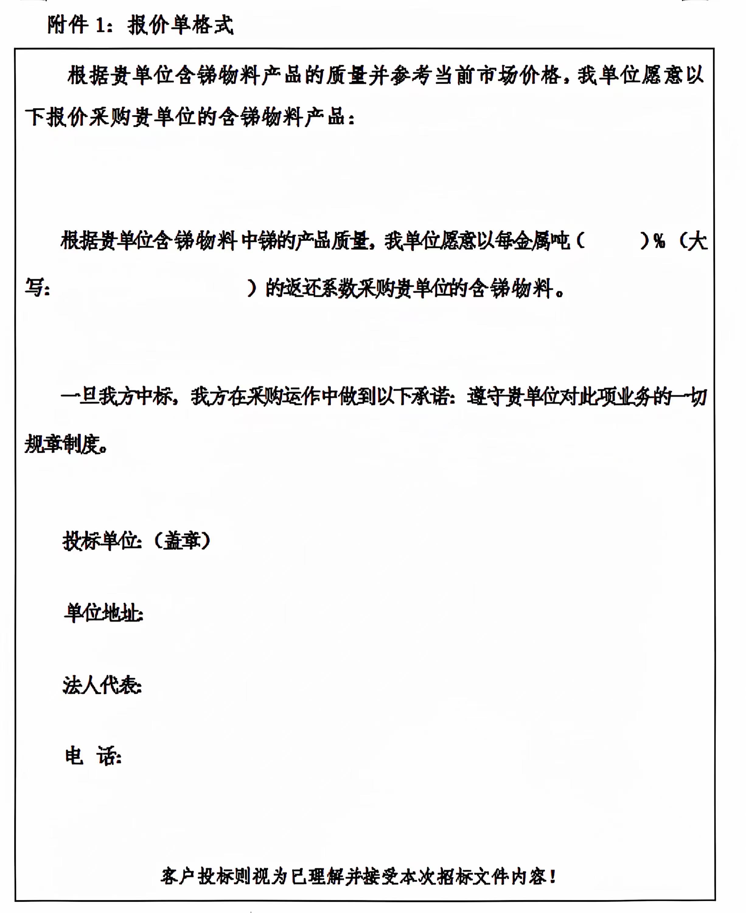 本次招標含銻物料以每噸干重中銻含量的返還系數進行報價。